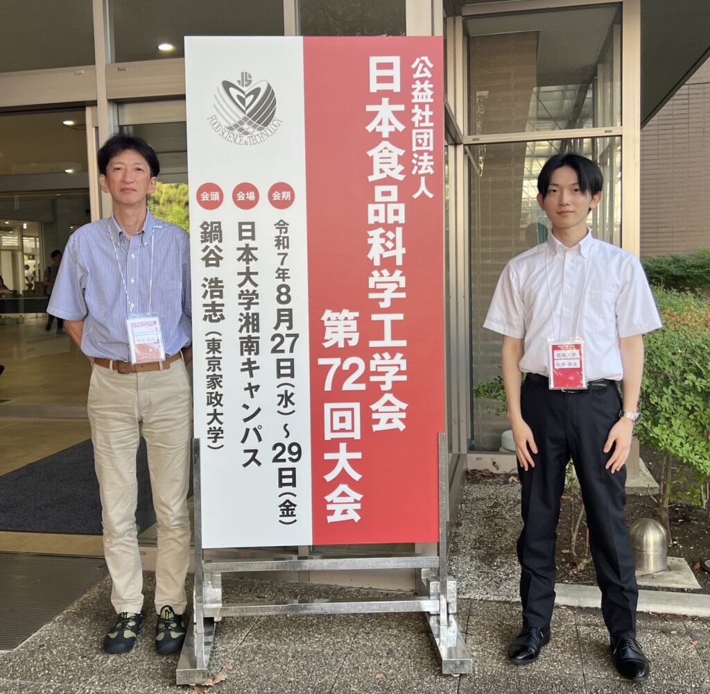2025.08.29 日本食品科学工学会第72回大会で発表しました 日本食品科学工学会第72回大会(2025年度、藤沢)で修士学生1人と教員が発表をしました。松栄 幸汰ら他2人:「乳酸菌と酵母の連続発酵によるぬか漬け様調味液の技術開発」熊谷 武久ら他3人:「キムチから分離されたLactilactobacillus sakei K6-1が生産する菌体外多糖」お疲れ様でした。